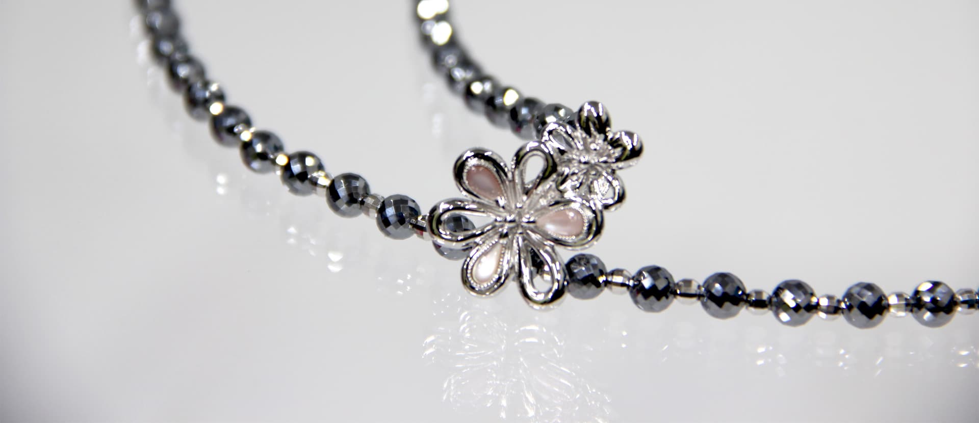 肩こり、首こりに効き目が期待できる超遠赤外線を出すエムスターズ鉱石を基に、貴金属や天然の宝石でデザインし、従来にない着けて効く&見られてお洒落な健康ジュエリー。